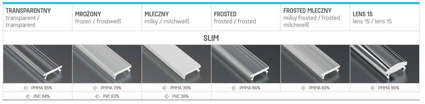 Klosze SLIM do profili LUMINES to płaskie przesłonki z wykonane z tworzyw sztucznych. Dostępne w pięciu odmianach stopnia przepuszczalności w zależności od zabielenia tworzywa, oraz w dwóch wersjach materiałowych: PVC (polichlorek winylu), PMMA (polimetakrylanu metylu).