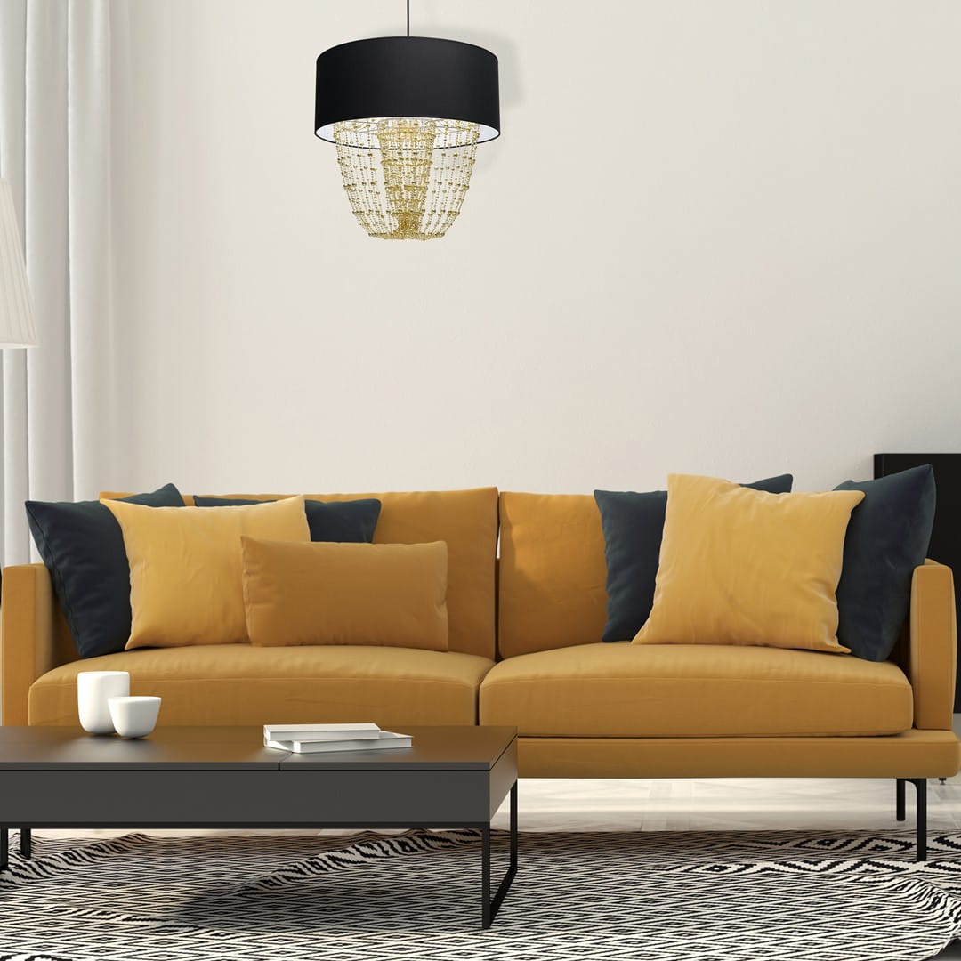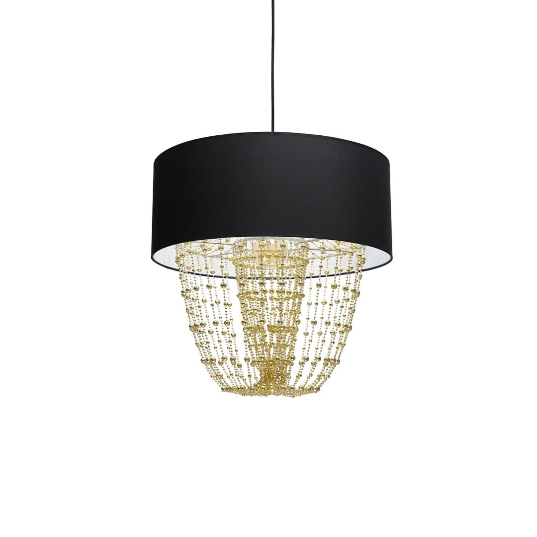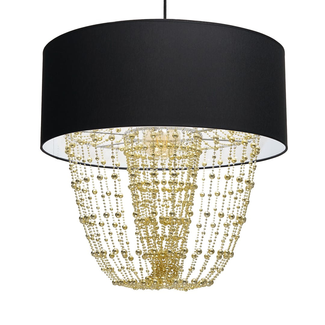 Modele z tej kolekcji charakteryzują się prostym, materiałowym kloszem w kształcie walca, jednak zwisające z jego wnętrza różnej długości sznury korali sprawiają, że całość prezentuje się niezwykle stylowo. Łańcuszki te mają jednak nie tylko walor estetyczny – dzięki nim światło efektownie się rozprasza i wprowadza w pomieszczeniu bardzo przytulny nastrój. Dodatkowym atutem lamp z tej kolekcji jest ogromna różnorodność kolorystyczna. Do wyboru są modele z kryształkami w kolorze złota i srebra, a klosze występują w barwie czarno-złotej, biało-złotej, butelkowej zieleni i srebra.