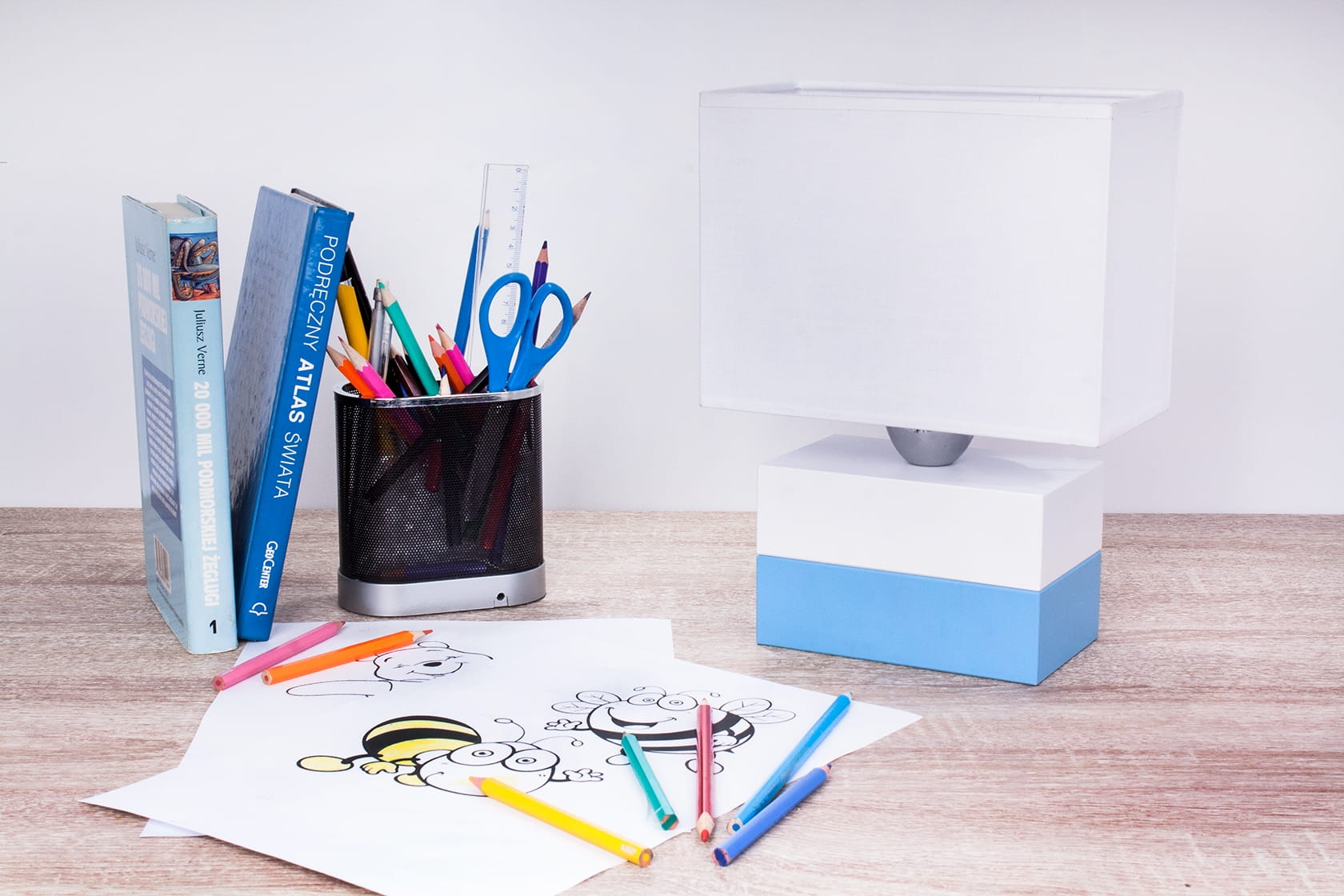 Dwukolorowa lampka stołowa kostka wykonana z drewna surowego pokryta ekologicznymi wodnym farbami bezpiecznymi dla środowiska . W oświetleniu zastosowano gniazdo pod żarówkę o trzonku E27 i maksymalnej mocy 60W. Uroku nadaje klasyczny biały abażur, który rozświetla lampkę. Spełni swoją funkcjonalność podczas odrabiania lekcji, czytaniu książki, jak i innych codziennych czynnościach u przytulając wnętrze każdego z pomieszczeń.
