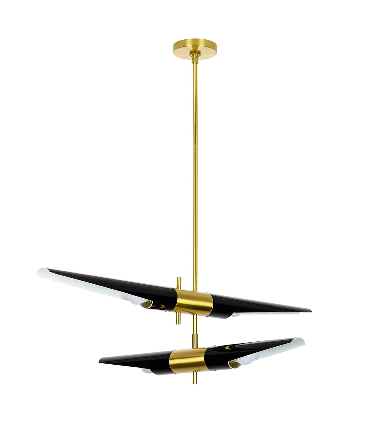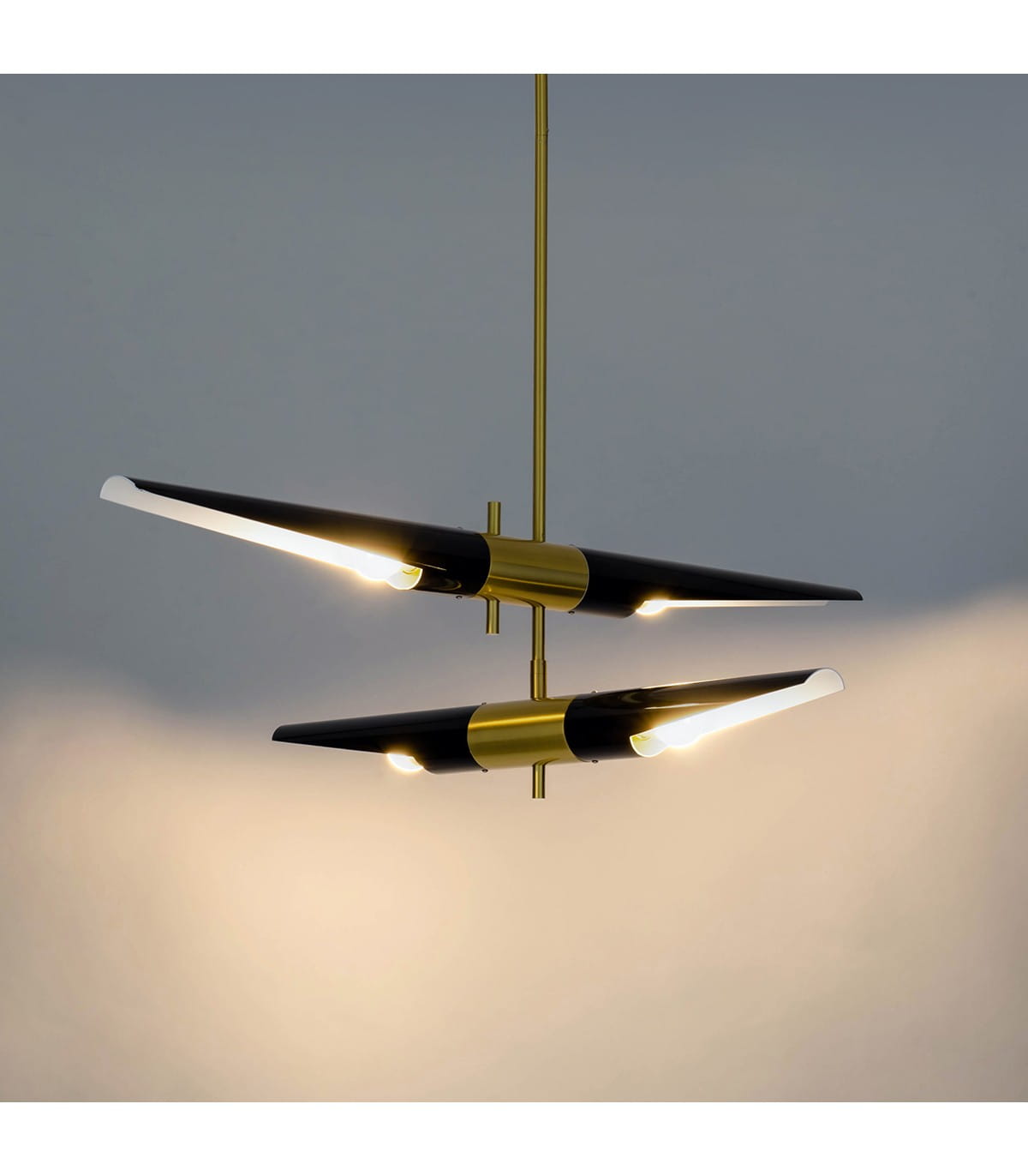 Lampa wisząca Apollo 2 czarna. Klasyczne połączenie czerni i polerowanej stali. Czarne, cylindryczne klosze zostały umieszczone na sztywnej konstrukcji z polerowanej, błyszczącej stali. Każdy z kloszy można obracać w poziomie, pozwala to na wiele konfiguracji i ułatwia doświetlenie pomieszczenia. Charakter całej konstrukcji podkreśla, stal polerowana na wysoki połysk. Lampy z kolekcji Apollo, doskonale rozświetlą jadalnię, salon lub kuchnię.