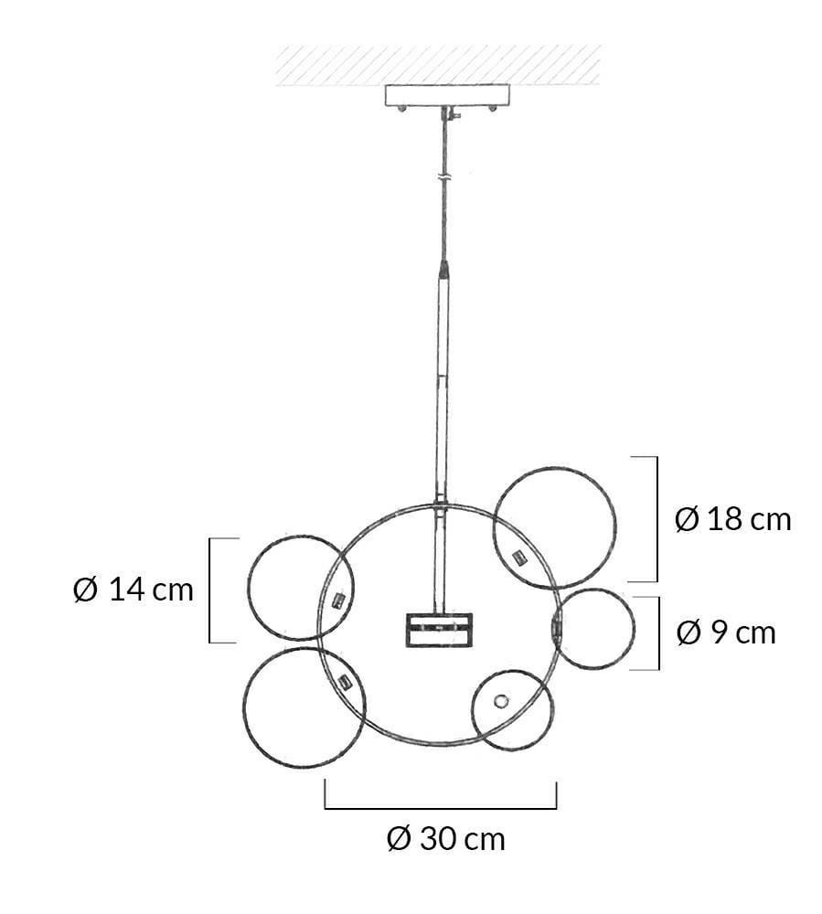 Do głównego klosza doczepione są pozostałe kule za pomocą mocowań w kolorze złotym. Całość przypomina połączone bańki mydlane. Snop światła skierowany jest zarówno do dołu oraz do góry.