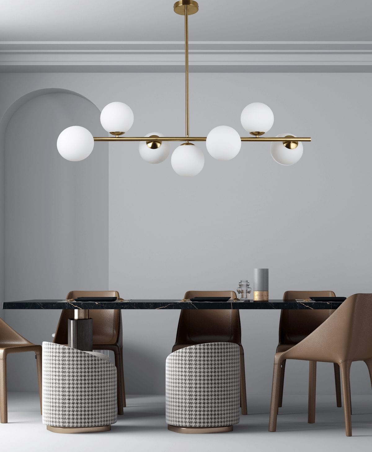 Złota oprawa lampy wiszącej FREDICA W7 genialnie wpisuje się w klimat nowoczesnego, minimalistycznego wzornictwa, które uszlachetnia, tworząc oświetlenie wytworne i z klasą, a jednocześnie doskonale wpisujące się w modne obecnie aranżacje przestrzeni salonów, gabinetów i jadalni. Dużą cechą lampy jest siedem kloszy umieszczonych na poprzecznej belce, co pozwala na równomierne doświetlenie wnętrza.