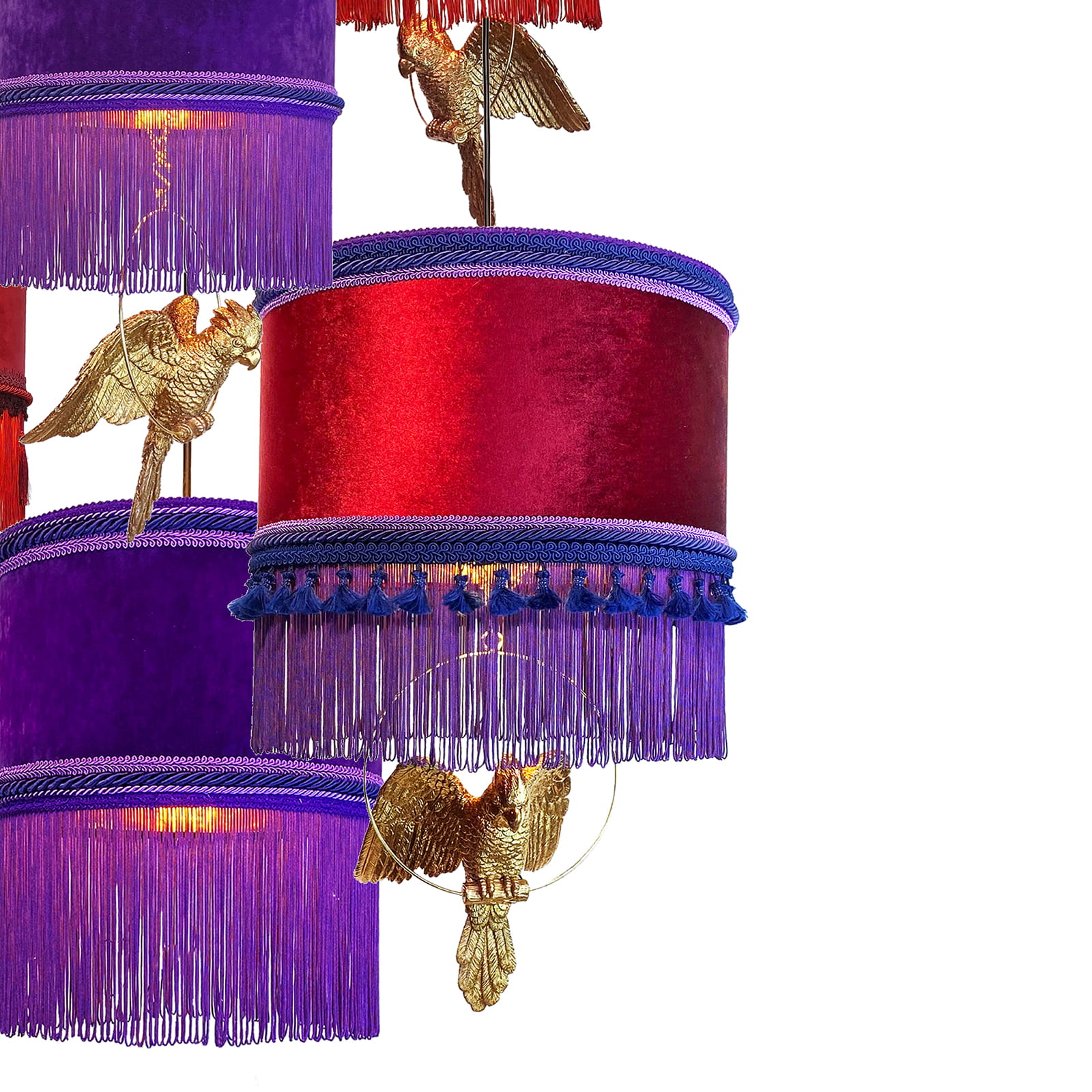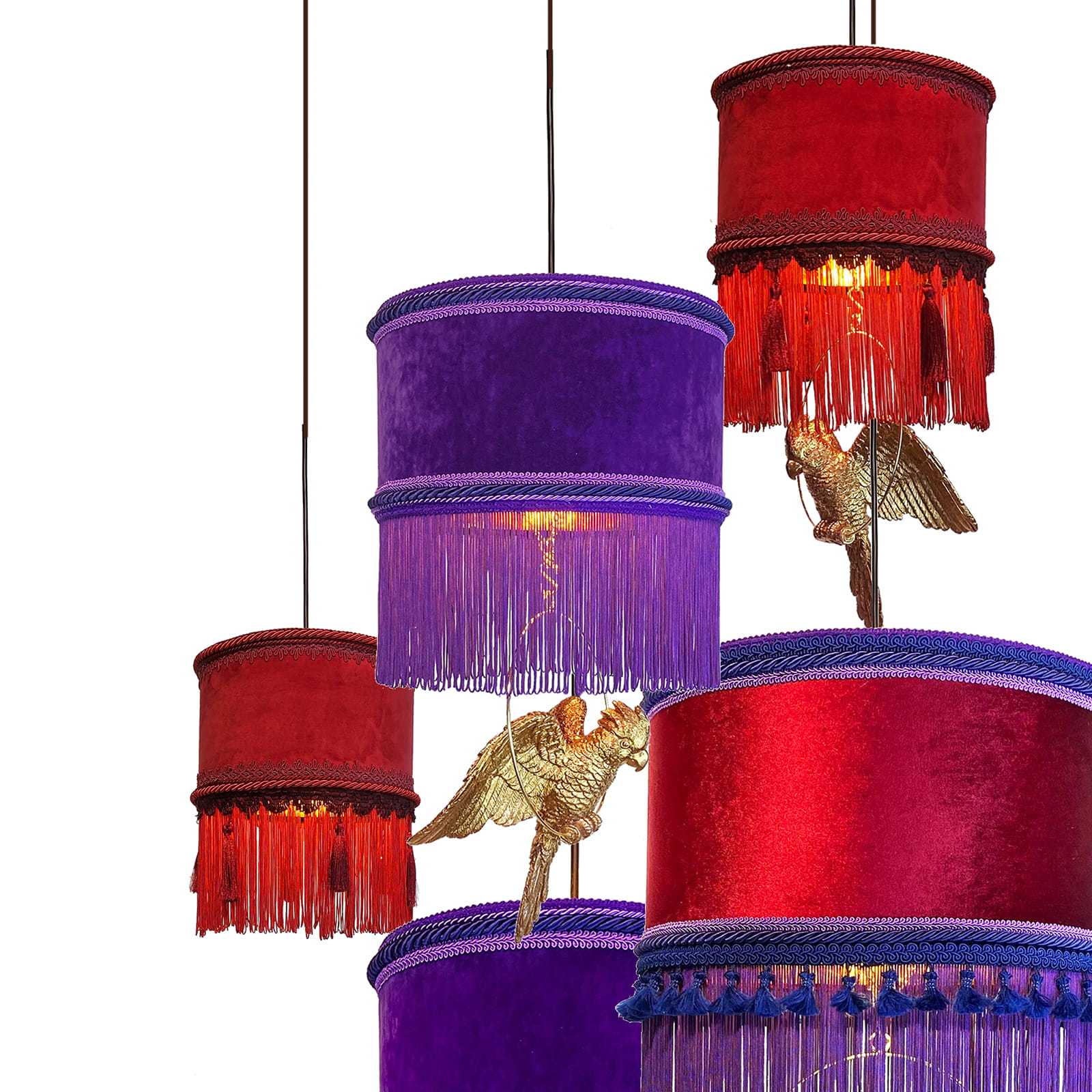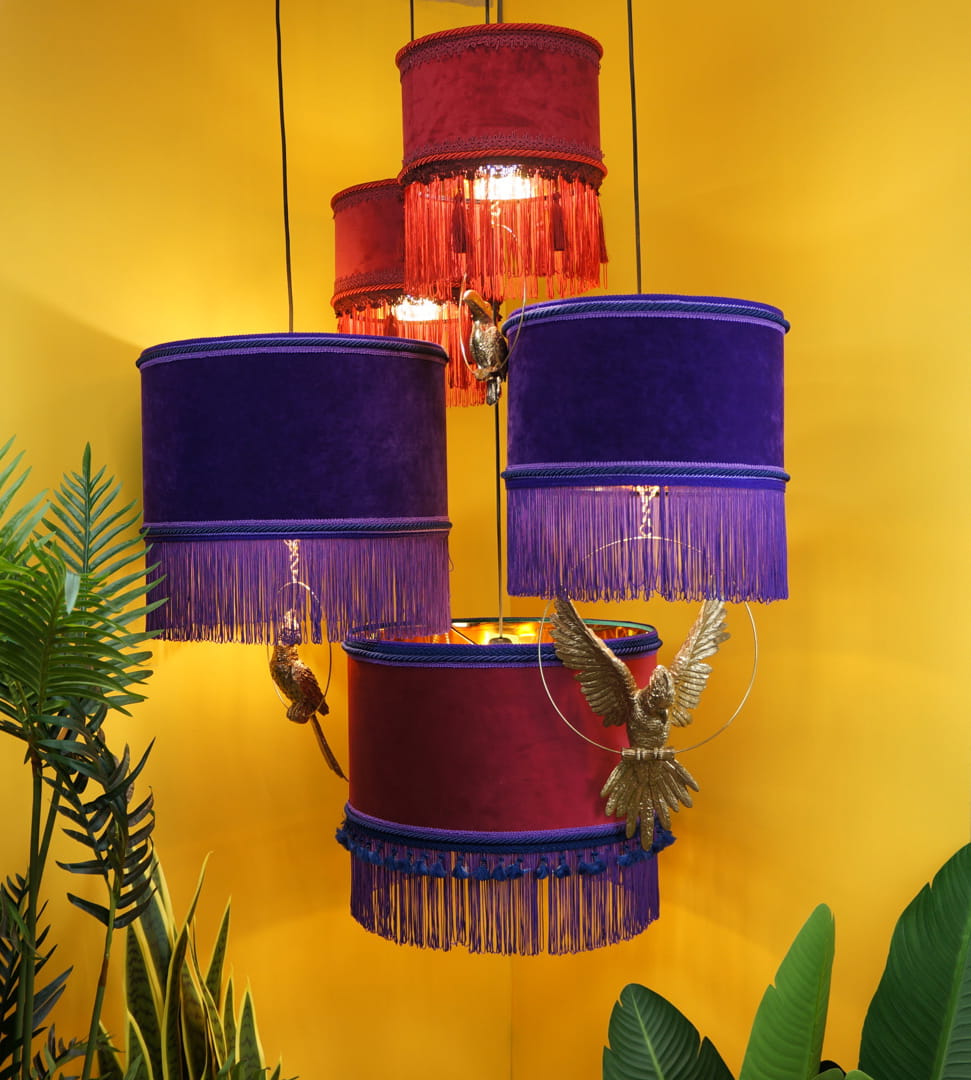 Lampa LANZAROTE to kilka klimatycznych, wiszących lamp wraz z figurami zwierząt. W środku lampy mają złoty kolor natomiast na zewnątrz zdobi je welurowy materiał w kilku wzorach i kolorach. Długie, zwisające frędzle to charakterystyczny element lampy LANZAROTE. Żyrandol jest bardzo efektowny i dodaje wyjątkowego charakteru każdemu pomieszczeniu. Jego wygląd przyćmiewa inne elementy dekoracyjne. Przewody w zestawie mają różną długość i można ją regulować za pomocą uchwytów mocowanych do sufitu.