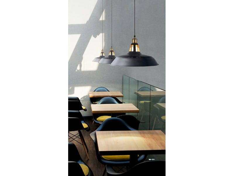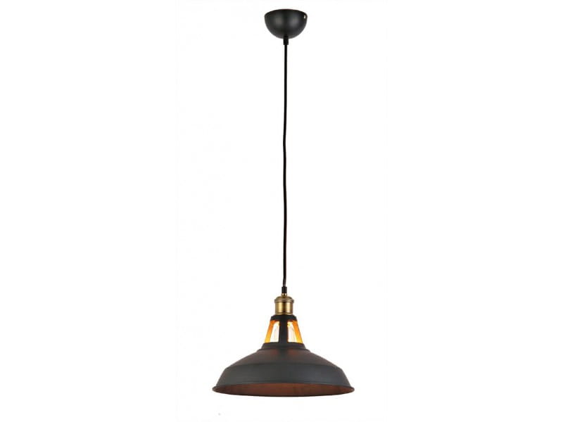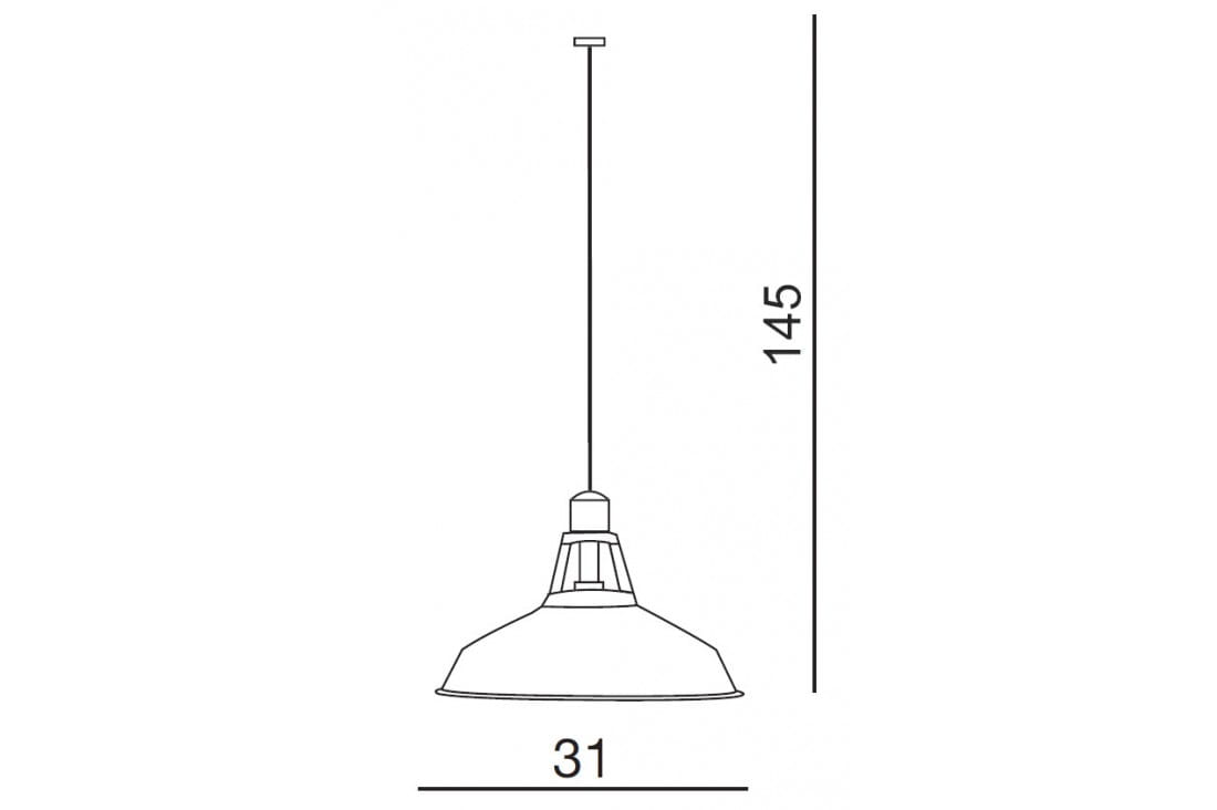 Lampa składa się z szerokiego, otwartego od spodu klosza, pod którym znajduje się jedno źródło światła. Całość wykonano z trwałego i odpornego metalu w kolorze czarnym.