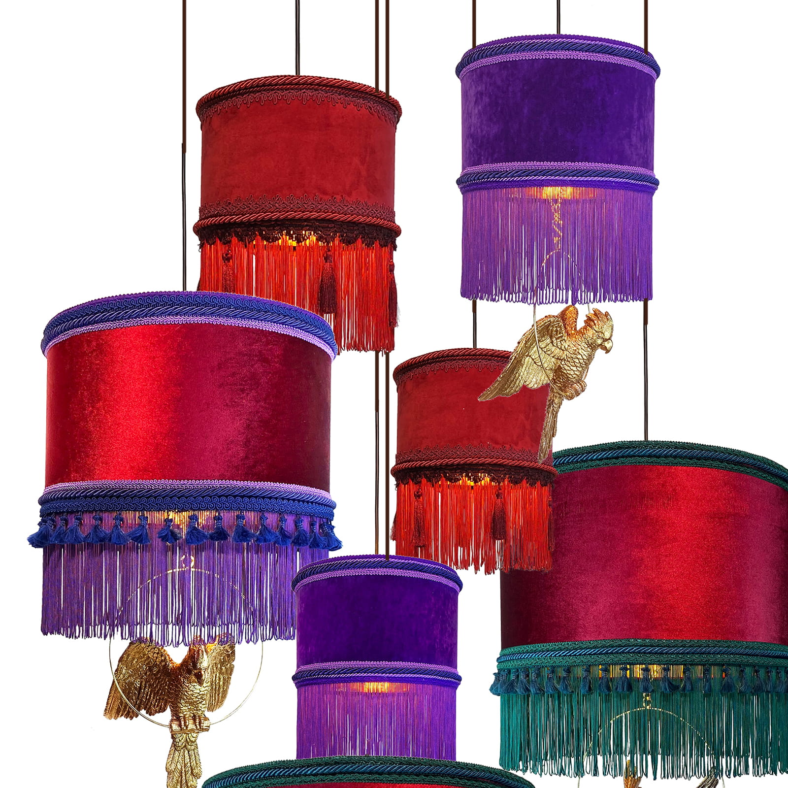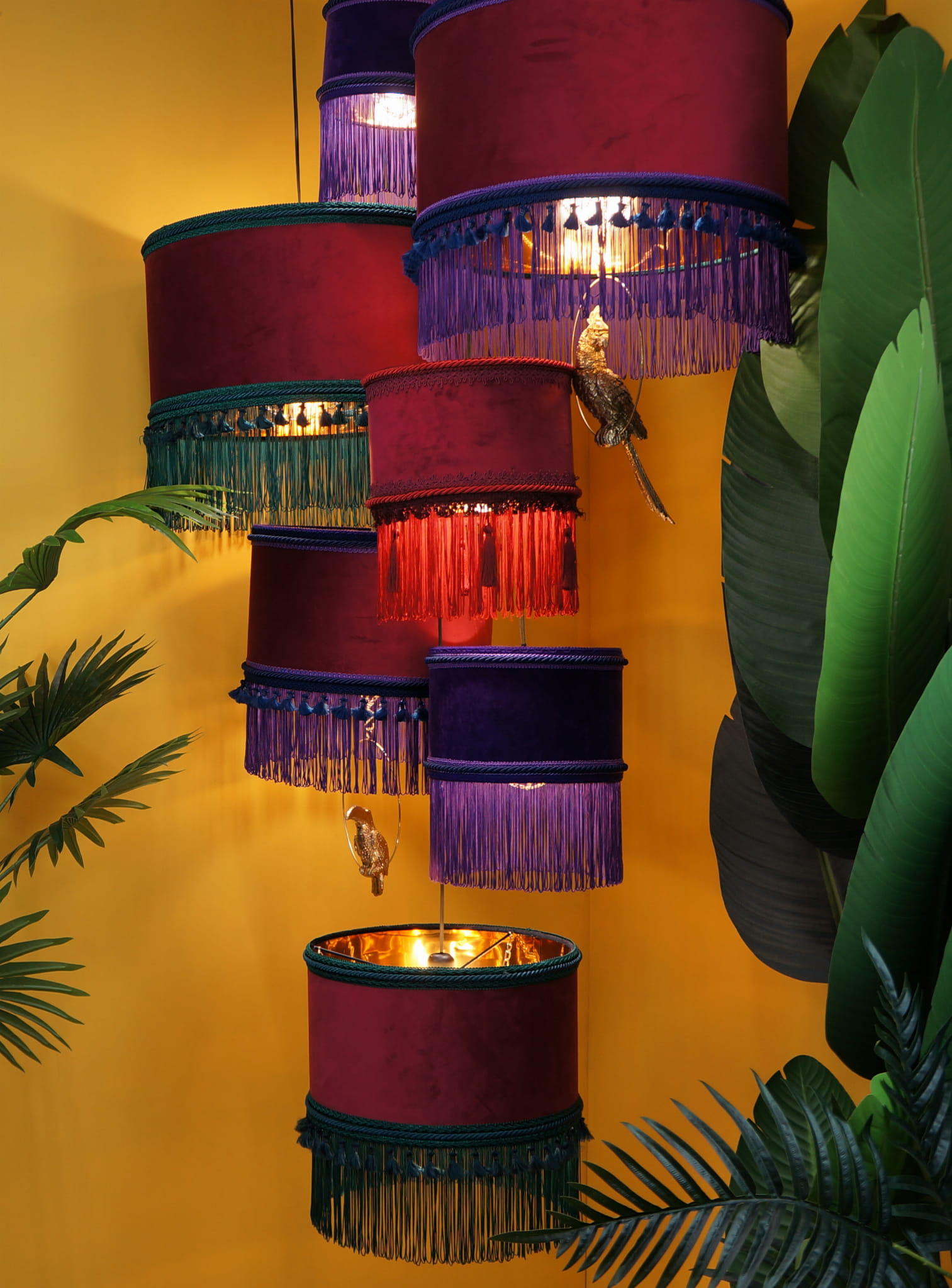 Lampa OAHU to kilka klimatycznych, wiszących lamp wraz z figurami zwierząt. W środku lampy mają złoty kolor natomiast na zewnątrz zdobi je welurowy materiał w kilku wzorach i kolorach. Długie, zwisające frędzle to charakterystyczny element lampy OAHU. Żyrandol jest bardzo efektowny i dodaje wyjątkowego charakteru każdemu pomieszczeniu. Jego wygląd przyćmiewa inne elementy dekoracyjne. Przewody w zestawie mają różną długość i można ją regulować za pomocą uchwytów mocowanych do sufitu.