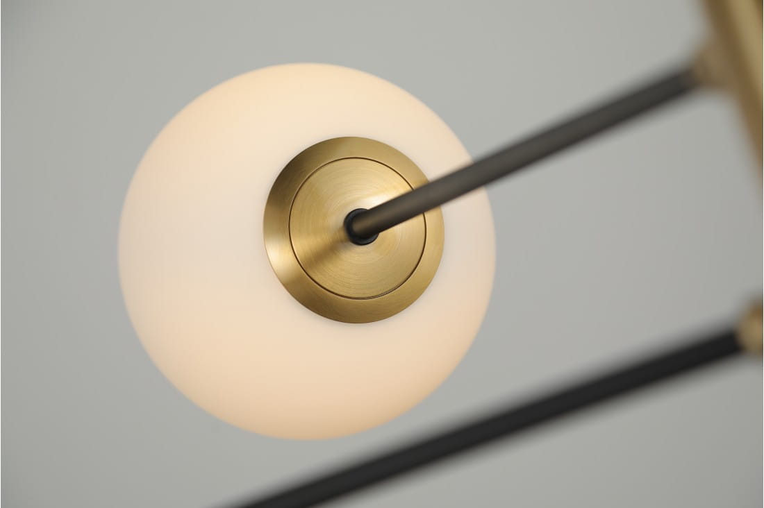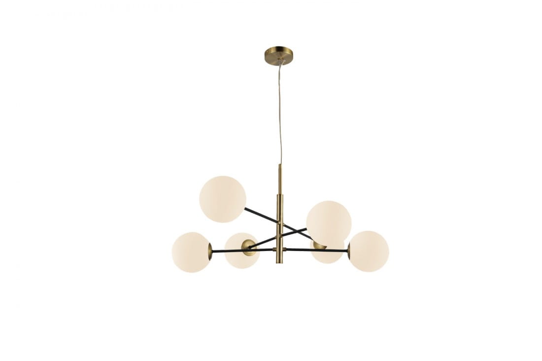 OVIEDO 6 ma aż sześć źródeł światła, okrytych kulistymi kloszami z mlecznobiałego szkła, pięknie rozpraszającego światło. Są połączone konstrukcją z prostych elementów metalowych. Całość podwiesza się do sufitu na cienkim przewodzie. Produkt współpracuje z energooszczędnymi źródłami światła LED, co znacznie obniża koszty domowego oświetlenia. W naszej ofercie lampa występuje w dwóch wersjach kolorystycznych (czarnej i czarno-złotej).