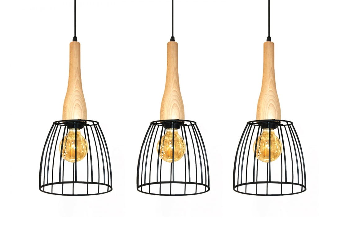 Lampa składa się z trzech niezależnych i nieosłoniętych źródeł światła, osadzonych w mocno wydłużonych, drewnianych oprawkach. Wokół każdego z nich zamontowano dekoracyjne siatki metalowe w kolorze czarnym. Każda z żarówek jest zawieszona na długim przewodzie, umocowanym do wspólnej dla wszystkich, prostokątnej podstawki.