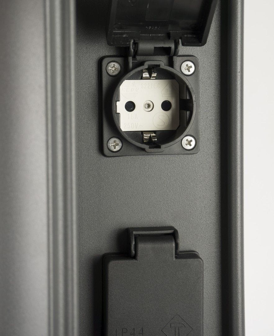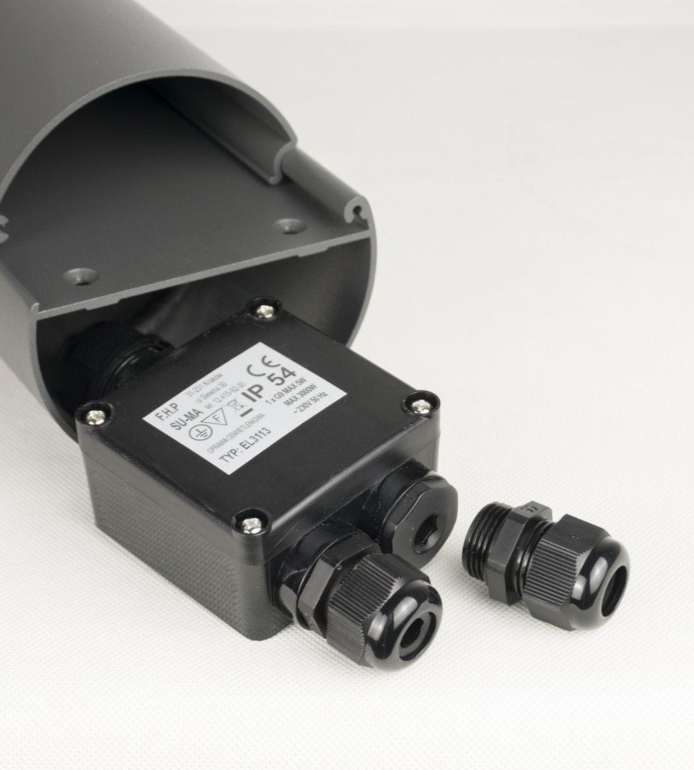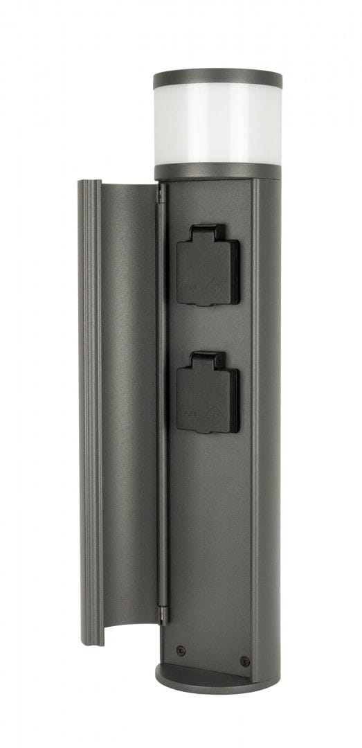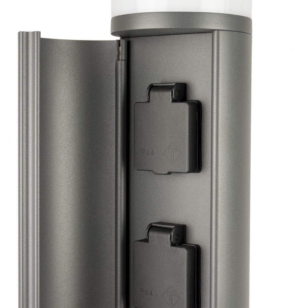 Elborn EL3113 to funkcjonalna oprawa oświetleniowa posiadająca dwa gniazda elektryczne, które można wykorzystać do podłączenia dowolnego sprzętu ogrodowego. Gniazda zostały ukryte za uchylnymi drzwiczkami, co pozytywnie wpływa na wygląd lampy w momencie, w którym nie są one używane. Oprawa została wykonana z aluminium lakierowanym proszkowy na kolor ciemny popiel.
