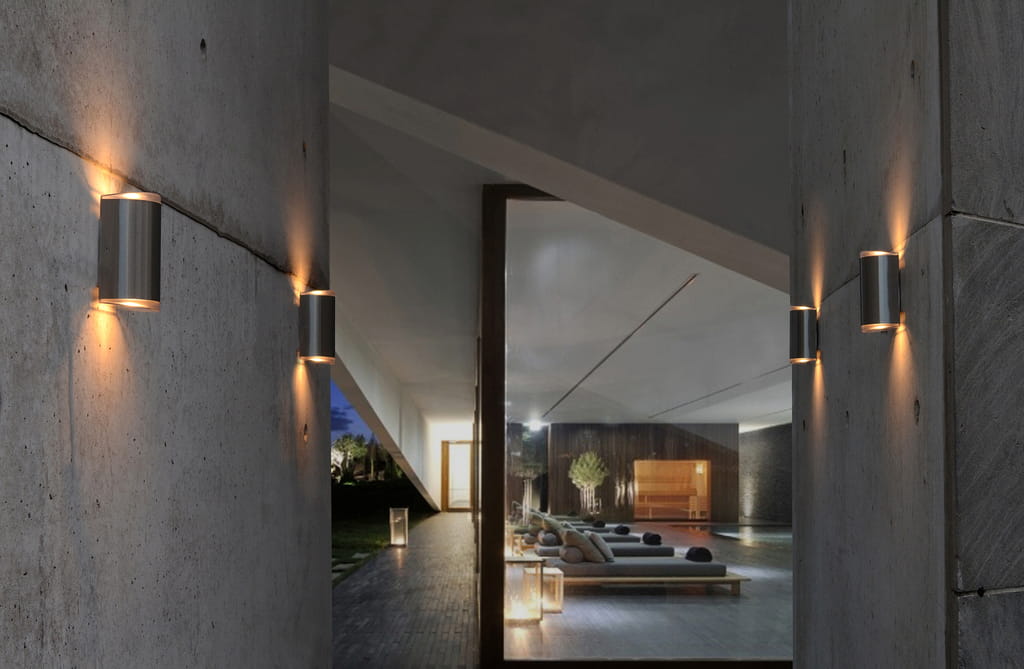Okrągłe światło góra / dół ze stali nierdzewnej z dyskretną świecącą częścią po obu stronach.