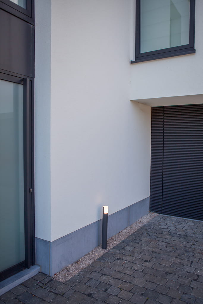 Antracytowa aluminiowa obudowa i mleczny biały klosz. Ruchoma głowica oferuje możliwość obrotu, co daje przyjemny blask na zewnętrznej ścianie lub przedni rozproszony strumień światła.