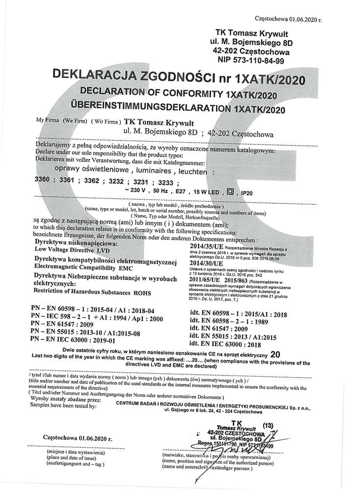 Rodzaj źródła światła - Żarówka z gwintem E27 moc max. 2x60W