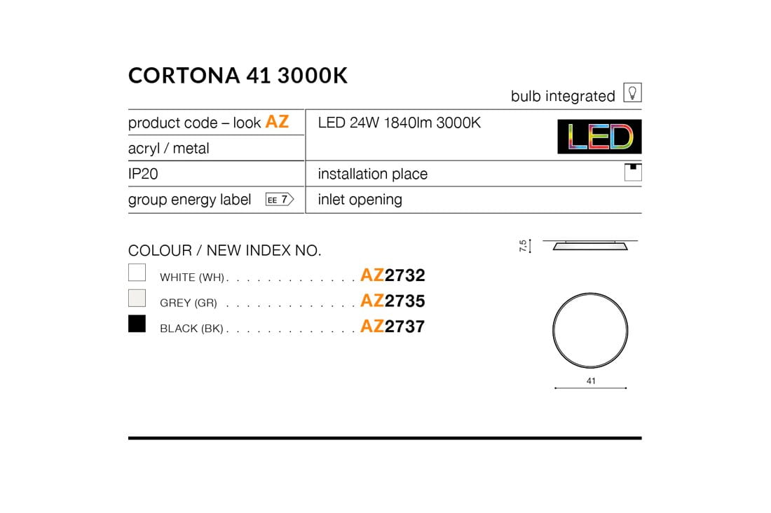 Lampa CORTONA 41 to mniejszy z plafonów z tej rodziny, obecnej w naszej ofercie. Można stosować je pojedynczo lub budować z ich pomocą zróżnicowane systemy oświetleniowe, gwarantujące optymalne warunki świetlne w każdym pomieszczeniu, bez względu na jego wielkość i kształt.
