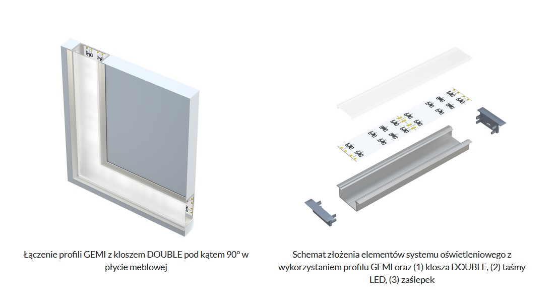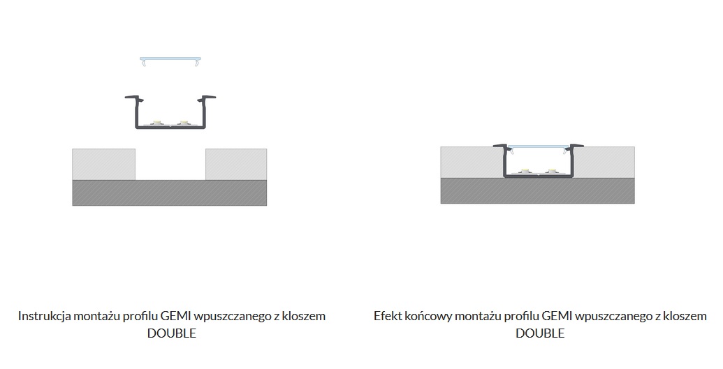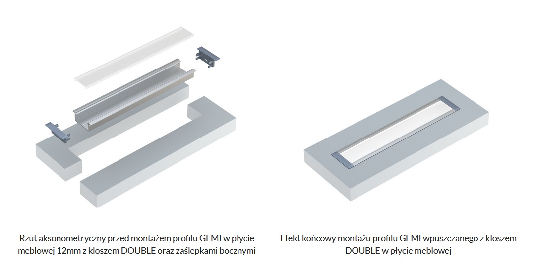 Niski profil aluminiowy GEMI to profil wpuszczany dla dwóch taśm LED. Nowy szeroki Profil LED do montażu w wyfrezowanych otworach. Pozawala na montaż dwóch równolegle ułożonych taśm LED.