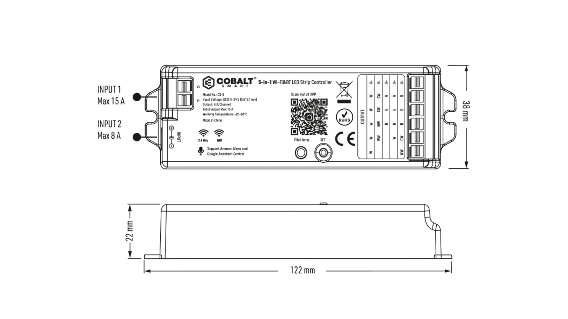 Sterownik LED COBALT Electro CS-5 wykorzystujący system sterowania PWM (modulacja szerokości impulsu) służy do sterowania źródłami światła. Posiada wbudowaną bramkę WiFi,która umożliwia regulację oświetlenia za pomocą aplikacji mobilnej TUYA Smart Life oraz jest kompatybilny z pilotami radiowymi RF 2,4GHZ.