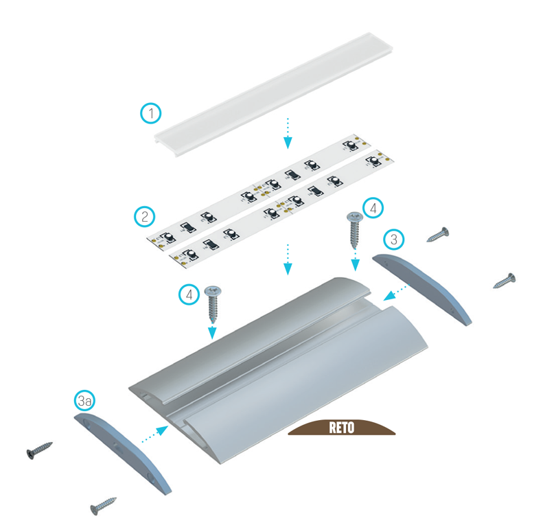 Schemat złożenia elementów systemu oświetleniowego z wykorzystaniem profilu RETO oraz (1) klosza BASIC, (2) dwóch taśm LED, (3) zaślepki bez otworu, (3a) zaślepki z otworem, oraz (4) wkrętów