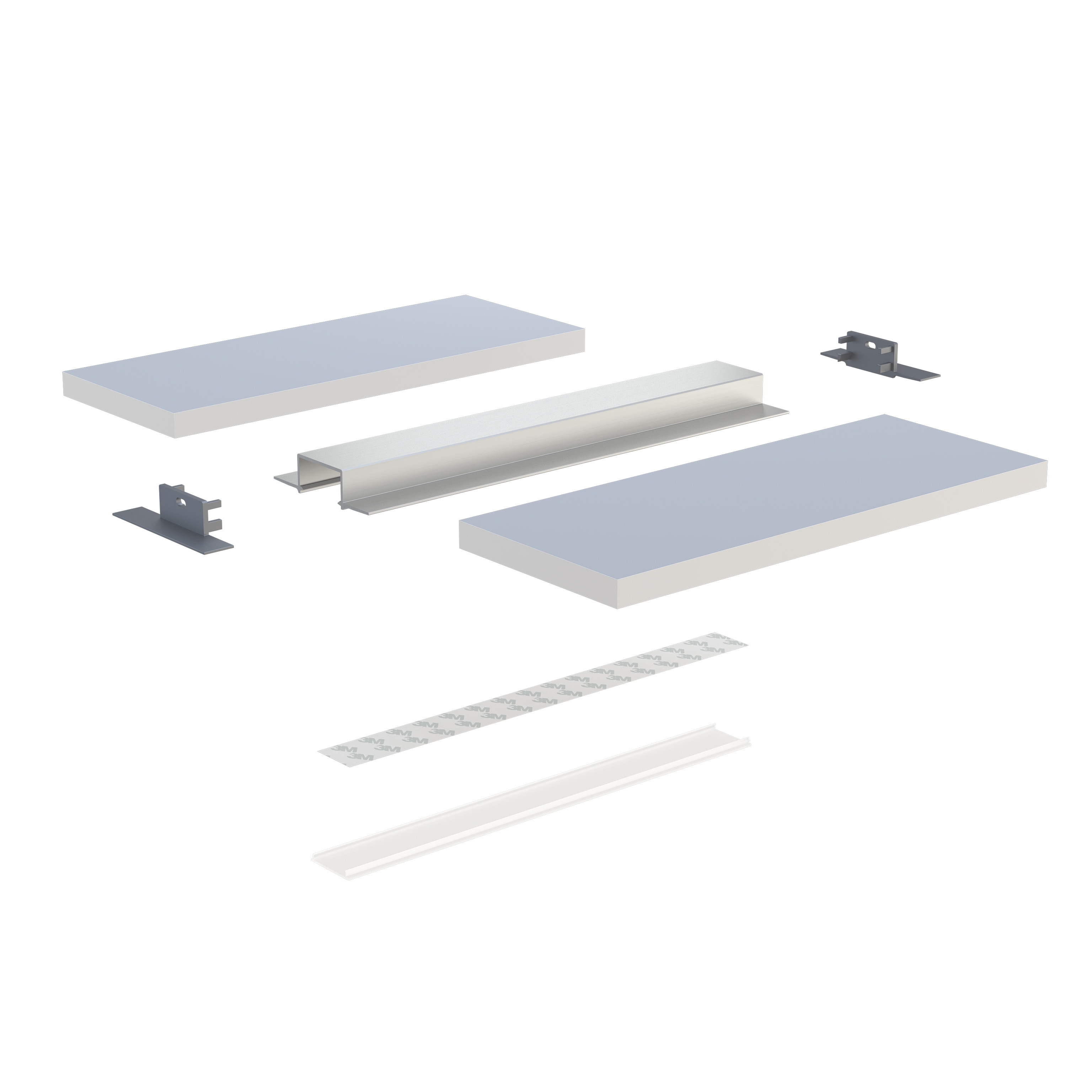 Schemat złożenia elementów systemu oświetleniowego z wykorzystaniem profilu HIRO oraz (1) klosza DOUBLE, (2) taśmy LED, (3) zaślepek